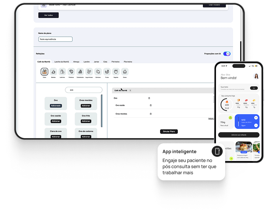 Crie planos altamente personalizados em minutos, com cálculos automáticos baseados na TACO e nos alimentos reais que o seu paciente gosta. A IA ajusta quantidades, macros e calorias com precisão clínica e consistência impossível de manter manualmente em escala.