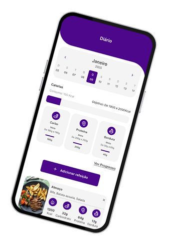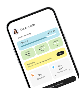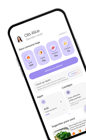 App do paciente com diário alimentar por foto que compara consumo com a meta em tempo real