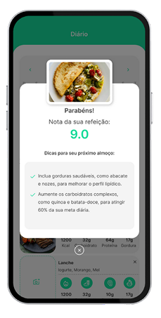 A cada refeição registrada, o paciente recebe imediatamente uma avaliação clara e sugestões práticas de melhoria — sem culpa, sem terrorismo alimentar e sem depender da próxima consulta.